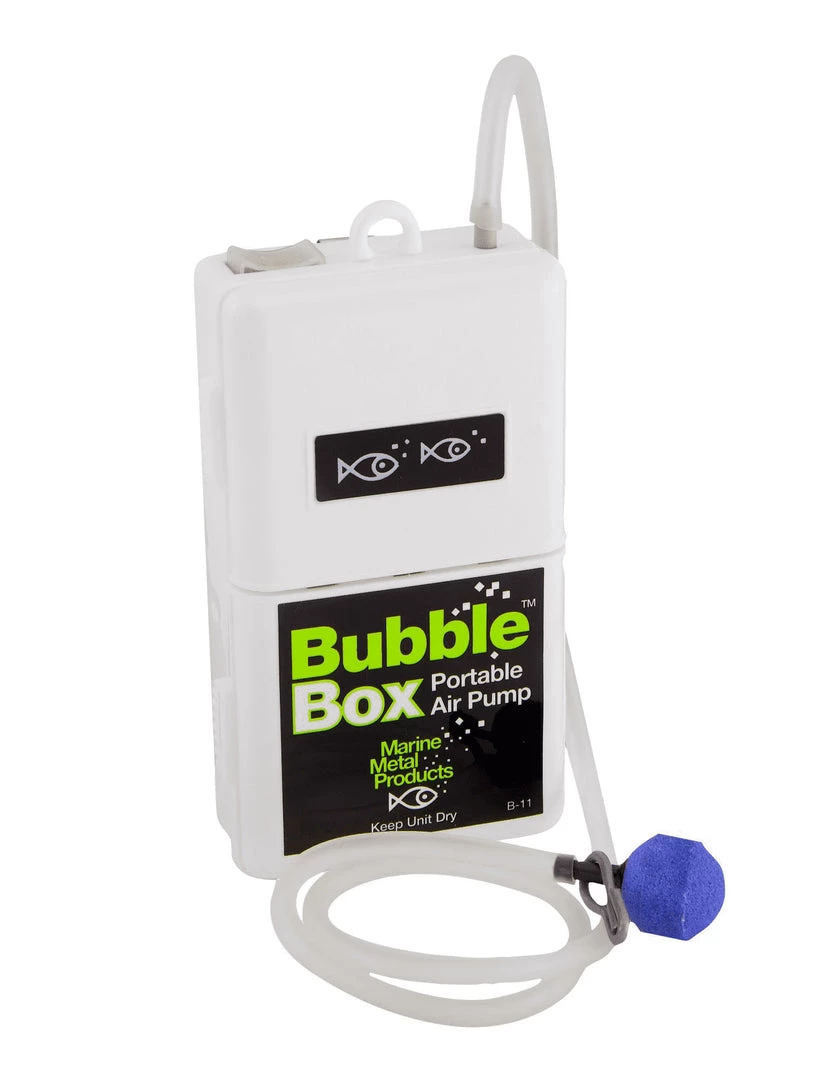 Quiet pump offers exceptional value with waterproof switch and weighted airstone. Runs up to 36 hours on two alkaline D batteries. Adjustable stainless steel mounting clip adapts to all livewells and coolers. Aerates up to a 7 1/2 gallon tank.