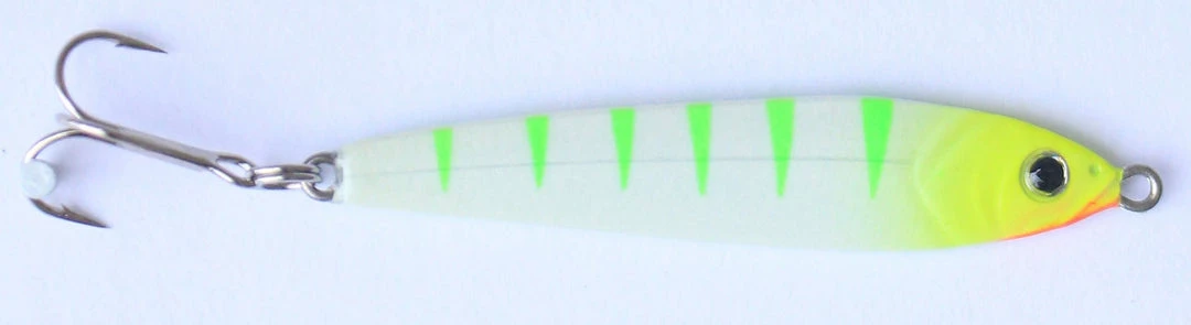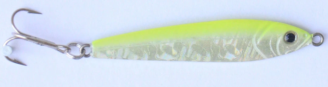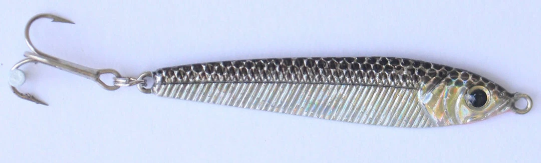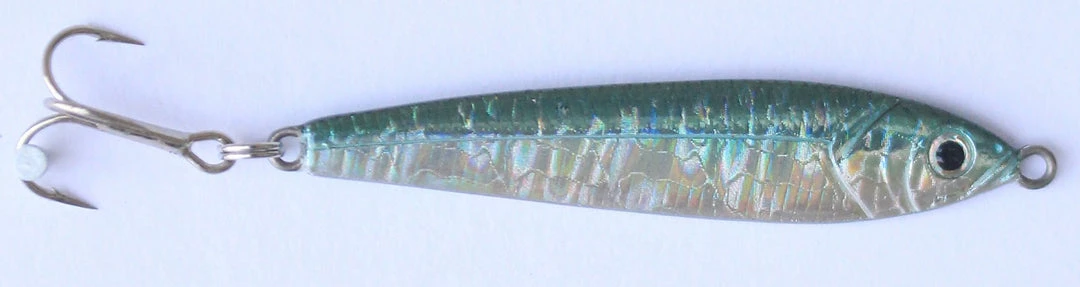 This field tested solid metal jig has a high quality holographic finish, realistic 3-D eyes, and is perfectly shaped to mimic baitfish. This extremely versatile lure comes in a proven variety of patterns and sizes, to use in both saltwater and freshwater applications. It has been shown to be successful in catching saltwater fish such as albacore, rockfish, stripers, and tuna, along with freshwater fish such as bass, trout, walleye, and pike.  Just match the right pattern and size to the conditions and targeted species. It is used in vertical jigging, casting, bottom bouncing, as well as yo-yo techniques.