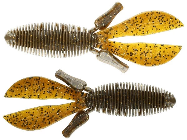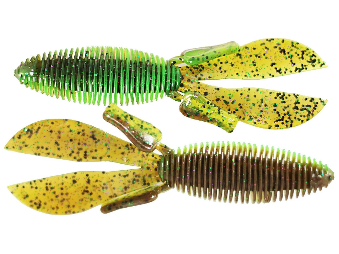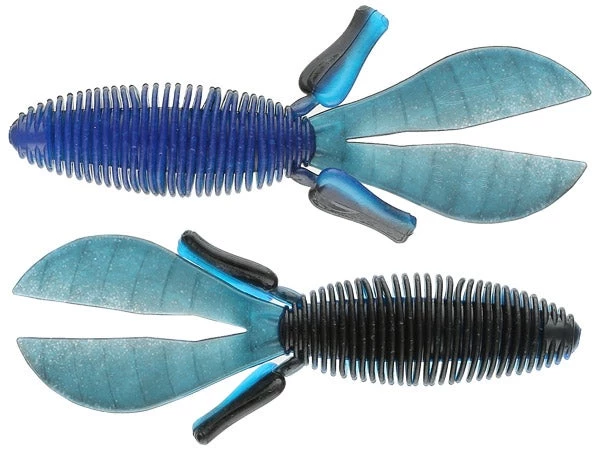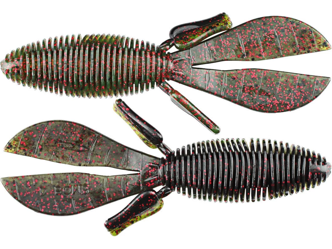 Pitching and flipping has a new go-to bait. The Missile Baits D Bomb is a bulky 4″ creature bait with a unique, ribbed body designed to displace lots of water, resulting in a straight fall. The tails sail when left connected or flap wildly when separated. The body is thinner where the hook comes out for easy hook sets, but has a thicker head so the bait stays on the hook.