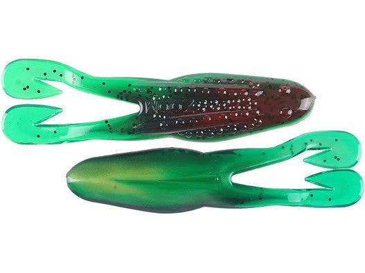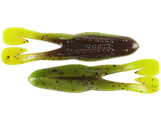 The Zoom Horny Toad offers some great features not found on any other soft plastic bait. The shape resembles a frog and most anglers will use them for a topwater frog presentation. The Zoom Horny Toad features two Ultra-Vibe legs that buzz and churn on the surface with a moderate retrieve, and it can be rigged weedless and fished over grass and pads. The Zoom Horny Toad is also great as a jig trailer with the Ultra-Vibe legs giving out plenty of fish attracting vibration in the water. The belly of the Horny Toad is slotted for your hook, allowing the point to push out further for a more positive hookset.